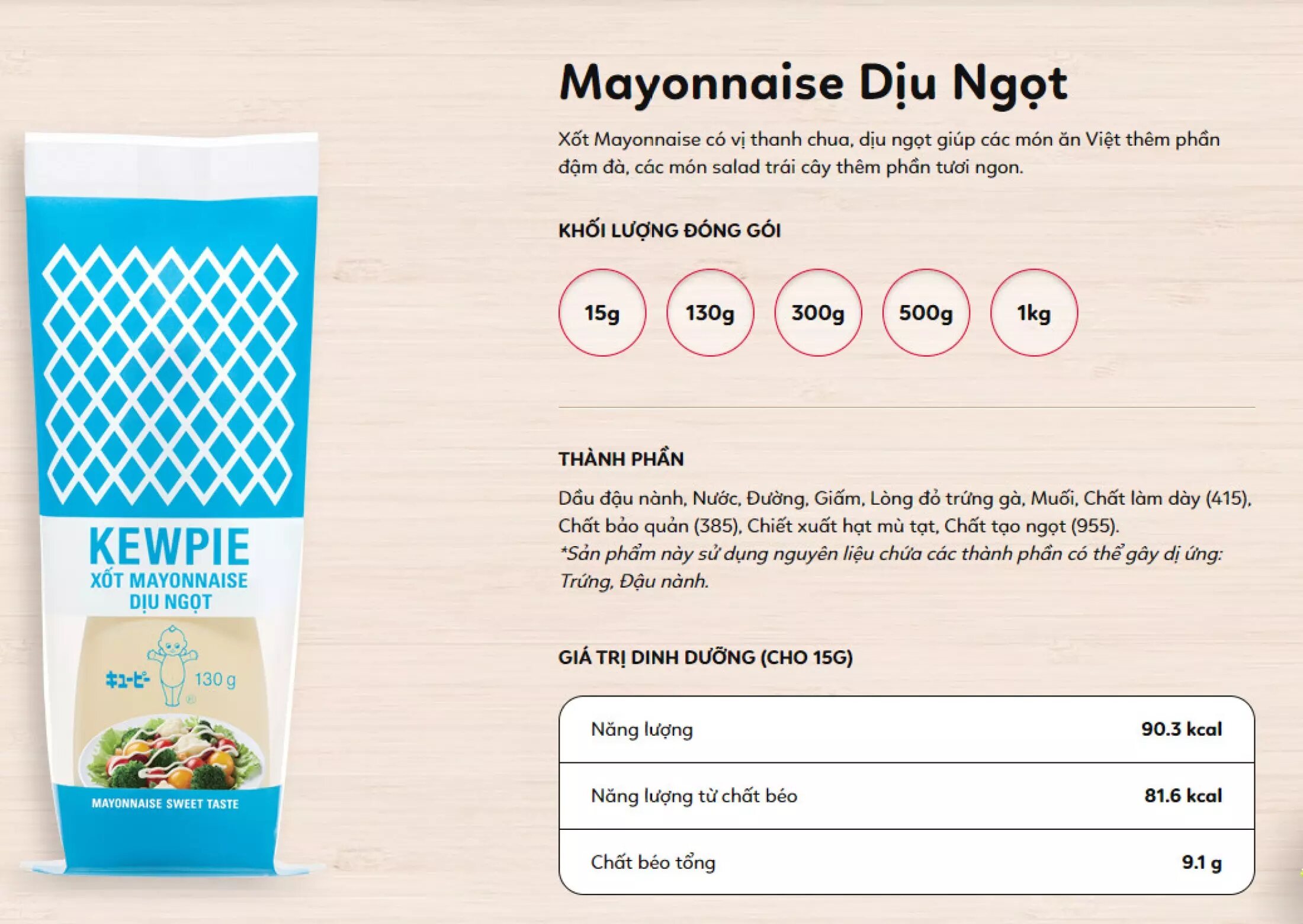 Kewpie Việt Nam cung cấp cho người tiêu dùng các loại nước xốt và mayonnaise với nhiều hương vị diệu kỳ mang đến cho mọi người cảm giác ngon miệng, yêu thích hơn trong mọi bữa ăn. Cùng với sự đa dạng về quy cách và mẫu mã giúp bạn dễ dàng lựa chọn sản phẩm phù hợp cho mình.