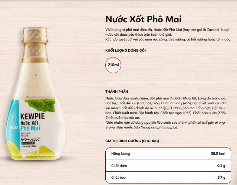 Kewpie Việt Nam cung cấp cho người tiêu dùng các loại nước xốt và mayonnaise với nhiều hương vị diệu kỳ mang đến cho mọi người cảm giác ngon miệng, yêu thích hơn trong mọi bữa ăn. Cùng với sự đa dạng về quy cách và mẫu mã giúp bạn dễ dàng lựa chọn sản phẩm phù hợp cho mình.